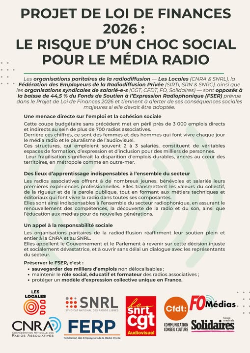 Les organisations paritaires de la radiodiffusion — Les Locales (CNRA & SNRL), la Fédération des Employeurs de la Radiodiffusion Privée (SIRTI, SRN & SNRC), ainsi que les organisations syndicales de salarié-e-s (CGT, CFDT, FO, Solidaires) — sont opposés à la baisse de 44,5 % du Fonds de Soutien à l’Expression Radiophonique (FSER) prévue dans le Projet de Loi de Finances 2026 et tiennent à alerter de ses conséquences sociales majeures si elle devait être adoptée